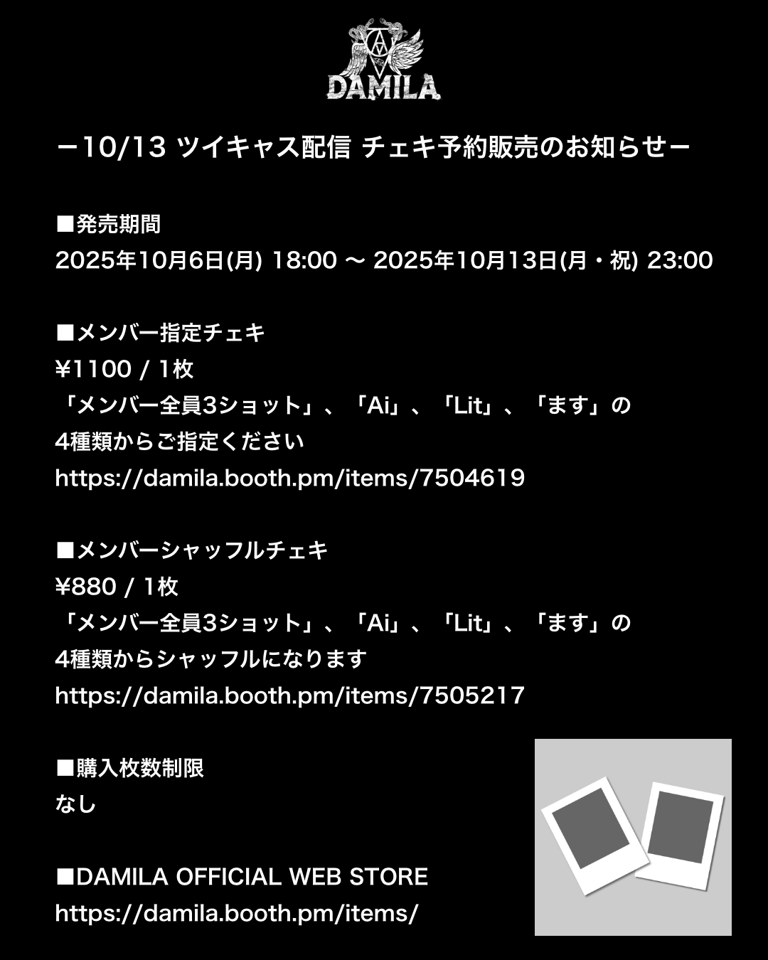 10/13 ツイキャス配信 チェキ予約販売のお知らせ